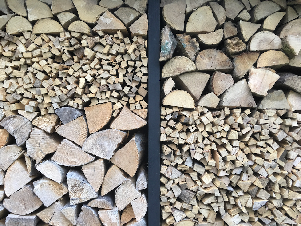 Vores brændestabel rummer 6 rummeter og er designet med 4 rum, hvor der er plads til forskellige brændetyper normalt ask og bøg da det er hårde sorter der brænder længe. Aks er ganske nem at findele til pindebrænde og ser godt ud. Vores strategi er at indlægge lag af pindebrænde forskudt så vi kontinuerligt kan brug fra toppen og hele tiden i samme lag har adgang til optændingspinde.