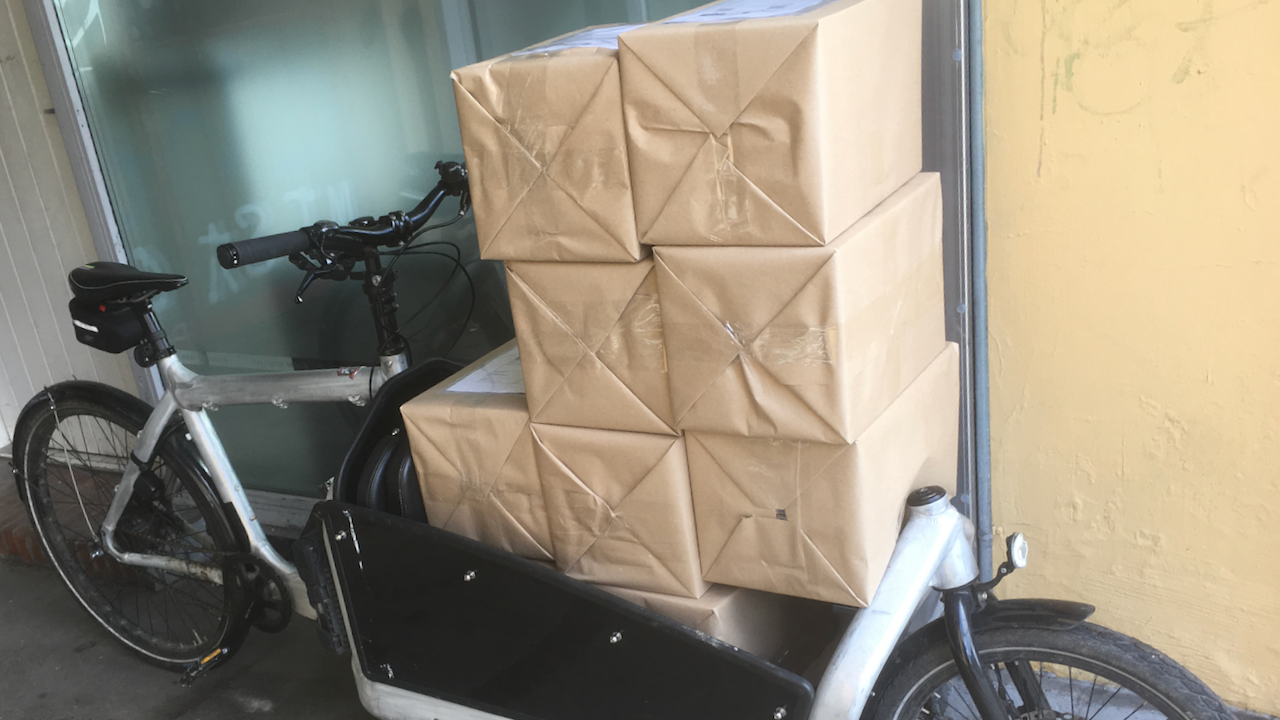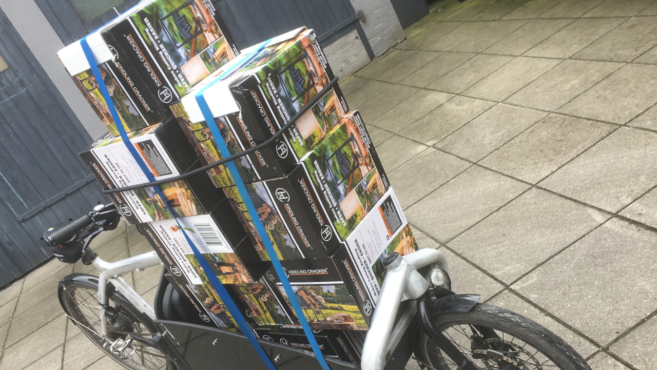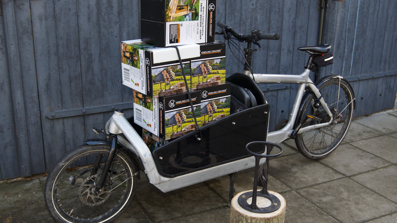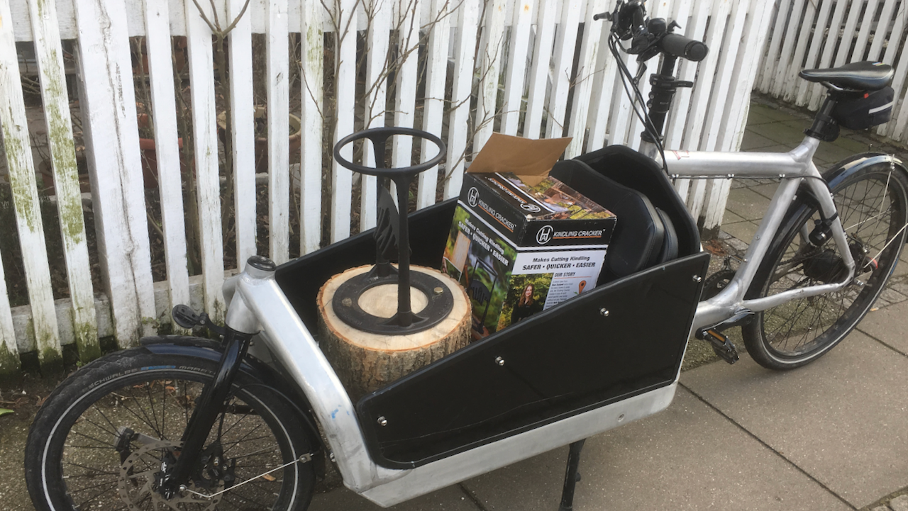I forbindelse med opstart af vores brændekløver gesjæft har vi skulle fragte mange, rigtig mange, æsker fra lager til kontor og så videre til pakkeshop. Brændekløveren er tung og det ville være oplagt at bruge bil det er bare så meget nemmere at suse gennem byen med dem på cyklen selv om der nogen gange er 50-60 kg. last. Så er det godt for miljøet, man får rørt sig og der er ingen irreterene parkeringsbøder i forruden.